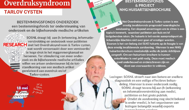 SOSNL is de landelijke stichting voor patiënten met het Overdruksyndroom & Tarlov cysten, wat wordt veroorzaakt door een verhoogde druk in het ruggenmergkanaal en hersenen en een ernstige progressief invaliderende neurologische aandoening is. De ziekte is zeldzaam en voor steun is SOSNL afhankelijk van donaties en giften. SOSNL heeft een aantal projecten/doelen opgezet. Doel 1 is een huisartsenbrochure ontwikkelen, deze moet medisch goed onderbouwd en onderschreven zijn. Doel 2 is steun voor onderzoek en wetenschappelijke publicaties. En doel 3 is voor lezingen aan artsen, waarbij SOSNL streeft naar een betere snellere diagnostiek en/of een veilige, effectieve behandeling. https://sosnl.nl/